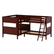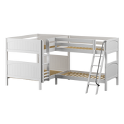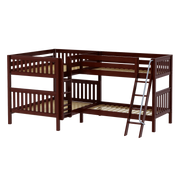 We connected a full size bunk + a twin bunk in an “L” shape to fit perfectly in a bedroom corner. This space-saving design sleeps 4 (or more!), making it the perfect solution for a shared bedroom or vacation home. Easy-to-climb, solid wood ladders on each end for dual access points. Patented Rock Lock system keeps stacked beds super sturdy and secure.