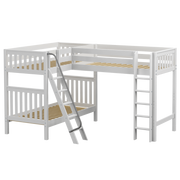 Our high corner loft bunk is just that – two beds stacked on one side connected to a single raised bed on the other. The result is a super functional “L” shape that fits perfectly in your bedroom corner.
