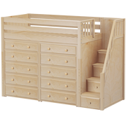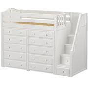 Our best-selling high loft bed becomes the ultimate storage cube. Matching dressers slide in perfectly beneath the bed, saving valuable floorspace. Added bonus, super safe staircase steps double as storage drawers.