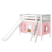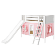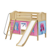 We added colorful curtains + slide to our classic low bunk, creating an adorable playhouse bed. Stacked design sleeps two comfortably β low height is perfect for small rooms and little ones. Angled ladder with sturdy handrail sticks out from bed at a slant for easy, comfortable climbing.