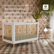 The popular Lolly 3-in-1 Convertible Crib highlights the natural beauty of our solid New Zealand pine wood with contrast styling and playful accents such as gently curved corners and tapered natural feet. Modern and functional, an included toddler bed conversion kit allows you to seamlessly convert from crib to toddler bed to daybed as your babe grows. GREENGUARD Gold certified to ensure healthy indoor air quality, the Lolly is the go-to choice for parents who appreciate style and safety.