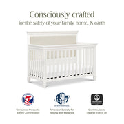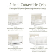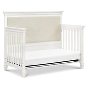 The Darlington 4-in-1 Crib brings the sophistication of relaxed French country style into the nursery. The Darlington balances delicate lines, gently detail molded tapered feet, and a lush upholstered back panel. Crib converts to a toddler bed, daybed, and full-size bed. Available in a Warm White finish.