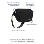 Keep it in reach while on the go. Small in size but big on detail, the Nuna stroller sling bag has six inside compartments and two outside for easy access to essentials. Compatible with all Nuna strollers except the TRVL™, it easily attaches to the push bar, keeping it organized and in reach. A luxe leatherette carry strap quickly converts it to an over the shoulder tote bag. Just attach or remove and go!