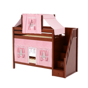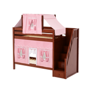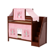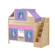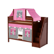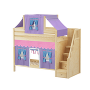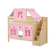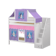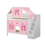 Colorful top tent + curtains turn our High bunk with staircase into an adorable playhouse bed! With 3.5 ft of space between top and bottom even big kids and adults can sit up comfortably. Stairs are a safe way to climb, plus steps double storage drawers.