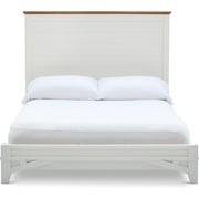- Crafted from premium poplar solids in a linen finish topped with warm oak accents