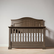 Jordan 4-in-1 Convertible Crib exudes style and refinement with a perfect balance of curve and line. Arched headboard top and straight footboard lines sculpted in solid wood for strength and longevity. The abundant architectural details are dressed up with our signature water-based and super healthy finishes. Conversion Kit, Toddler Kit and matching case units are available to complete your nursery set.